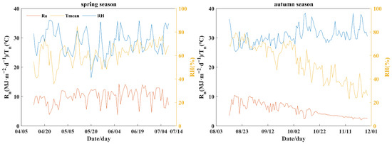 The solar radiation (Ra), air temperature (Ta) and relative humidity (RH) in the two seasons were recorded continuously using a standard automatic weather station (Hobo, Onset Computer Crop, Bourne, MA, USA) installed at the center of the greenhouse. All meteorological mean variables every 30 min were calculated automatically by a data logger, and the daily average value of Ra, Ta and RH are shown in Figure 1.