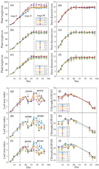 Plant height, stem diameter and leaf index (LAI) were measured at intervals of 7–10 days during the whole growth period. Leaf length and the maximum width were measured, and the leaf area was determined by the sum of the rectangular area of each completely developed leaf (the product of leaf length and maximum width) multiplied by a parameter of 0.64 [36,44]. The LAI was the ratio of leaf area to land area of each plant. Chlorophyll content was measured by a handled chlorophyll analyzer (SPAD502, Spectrum, Aurora, IL, USA, 0.1) every 7–10 days.