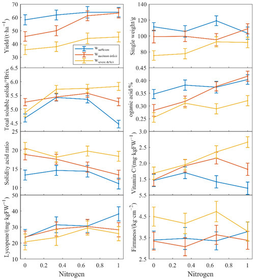 The two-way ANOVA showed that the water more pronouncedly affected the results than the nitrogen treatments, indicating that, compared with nitrogen, water occupied a dominant position in tomato yield and fruit quality, in agreement with the experimental results in northwest China [35,49].