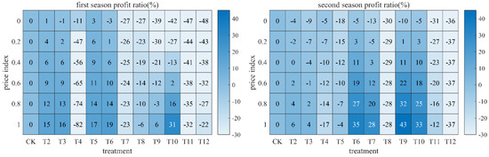 The heat map of net profit percentage change compared to CK under different treatments is shown in Figure 4. Yield dominated the comprehensive benefits when the market price sensitivity was low (R0~0.6), and the highest profit ratios found in T5 and T6 were 11% and 19% in the first and second seasons, respectively. Sufficient irrigation and mild nitrogen promised a relative high yield. As the sensitivity of price improved (R0.8~1), quality became more important than yield, and severe deficit treatment with high fruit quality reached the highest profit. The profit ratio of T10 reached 31% in the first season and 33% in the second season. Similar results were also found in grapes [50].