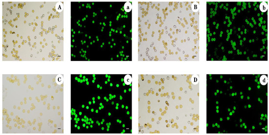 Light field and fluorescence magnification (10×) image of C.oleifera after staining with FDA dye. Capital letters (A–D) and lowercase letters (a–d) represent microscopic observations of diploid, tetraploid, hexaploid, and octoploid pollens in bright field and fluorescence, respectively. Bar = 50 μm.
