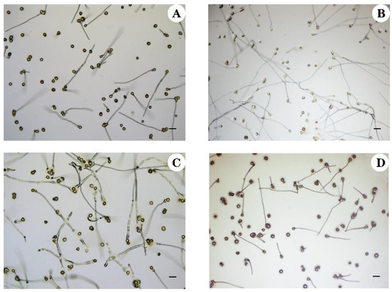 Pollen germination after 2 h in culture medium of C. oleifera. (A–D) represent the pollens of C. oleifera at four ploidy levels of 2, 4, 6, and 8, respectively. Bar = 100 μm.