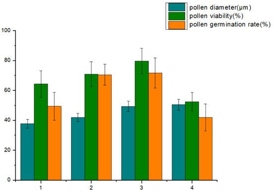 Comparison of the average diameter, pollen viability, and pollen germination rate of four ploidy C. oleifera pollens in the column chart; 1, 2, 3, and 4 on the abscissa represent diploid, tetraploid, hexaploid, and octoploid, respectively.