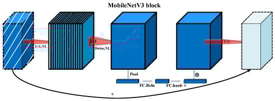 Aiming at the above problems, the MobileNet network model was introduced into the backbone feature extraction network of the traditional YOLOv5 algorithm and PSPNet algorithm. This model is a lightweight deep neural network proposed by Google for embedded devices such as mobile terminals. It is the result of a comprehensive consideration of training accuracy and network model performance, and its core idea is the separable convolution operation []. MobileNetV3 in this series of models was built upon the first two generations of V1 and V2, and includes new improvements, achieving excellent performance and speed among existing lightweight models. MobileNetV3 is mainly improved from MnasNet [], and the main improvements include the following aspects: