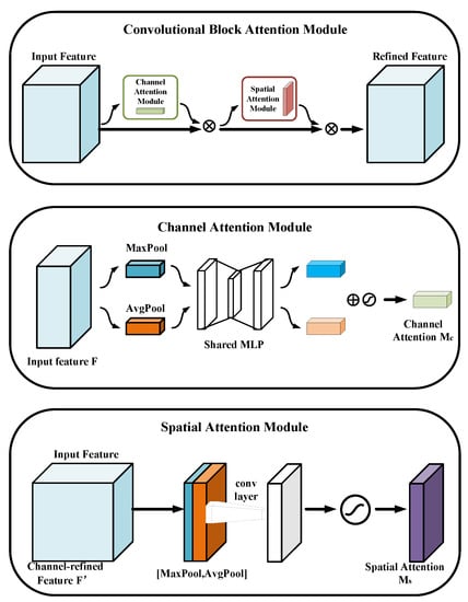 A CBAM (convolutional block attention module) is a lightweight convolutional attention module that sequentially derives attention maps along two independent dimensions of channel and space from a given intermediate feature map. Then, the attention map is multiplied by the input feature map for adaptive feature refinement. The structure of the CBAM is shown in Figure 4. Because the CBAM is a widely used lightweight attention module, it can be easily embedded into the basic CNN for end-to-end training, and only a small amount of computation is added. To calculate channel attention effectively, it is necessary to compress the spatial dimension of the input feature map. To aggregate spatial information, average pooling is typically used, but maximum pooling can collect unique object feature information and can infer more detailed channel attention. Therefore, the features of both average pooling and max pooling are used in the spatial information aggregation. The structure of the channel attention mechanism is shown in Figure 4, and the final channel attention mapping expression is shown in Formula (2):