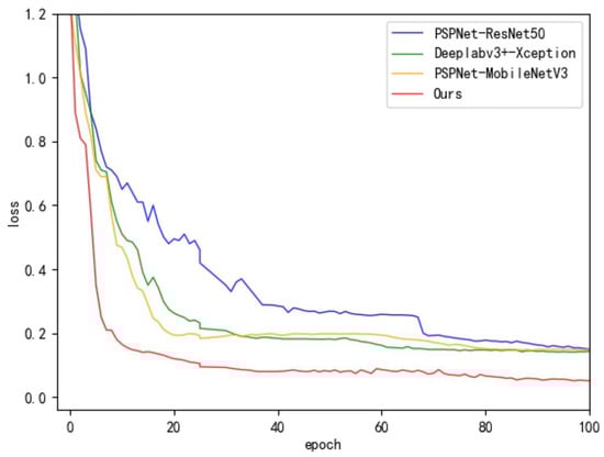 In addition, to describe the convergence speed of different models more intuitively and fairly, each model in this experiment used the cross-entropy loss function during training and performed a complete training process. The trend of the loss of each model in the dataset of this study is shown in Figure 8. Figure 8 shows that the improved PSPNet semantic segmentation model reached convergence in the 34th round of training, which was faster and more stable than for the other three models. As a result, the loss of the proposed algorithm decreased most quickly and was the most stable of the tested algorithms, demonstrating that the proposed algorithm was more efficient. A comparison of the experimental results showed that the proposed algorithm performed better than the other three network segmentation models in terms of training time, detection accuracy, and detection efficiency, which showed that the proposed algorithm was more suitable for antler mushroom size classification production operations with a high resolution and more detailed features.