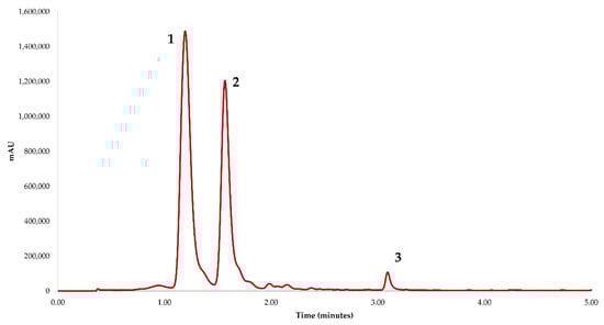 Chromatogram of the betalains identified in Opuntia dillenii extracts (λ = 540 nm). 1. Betanin; 2. Isobetanin; 3. Neobetanin.