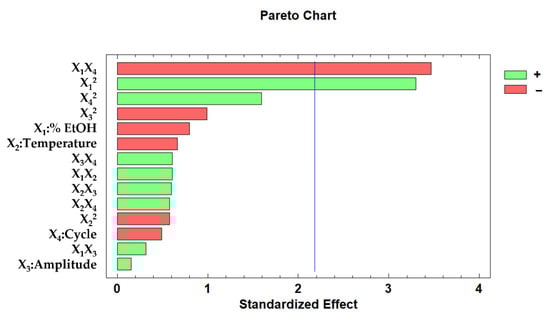 In this equation, X1 represents the percentage of EtOH in the solvent, X2 the extraction temperature, X3 the amplitude, and X4 the cycle. Finally, the optimal conditions for UAE were calculated based on the previous data, and the results were as follows: 100 mg of samples extracted with 20 mL of solvent (60% EtOH) at 20 °C, with 22% amplitude and a cycle of 0.2. The optimal value of the cycle was at the lowest end of the evaluated range. No lower cycle values were tested, since 0.2 is already a rather low value for ultrasounds. In addition, numerous researchers have already proven that the application of this cycle value to UAE processes effectively enhances yield extractions [36]. On the contrary, the percentage of ethanol was at the top end of the evaluated range and, consequently, an extension of such range was to be considered.