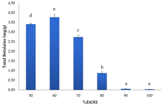 Total betalains extracted (mg/g sample) according to the percentage of EtOH in the solvent. Different letters indicate significant differences with 95% of confidence according to Duncan’s post hoc analysis.
