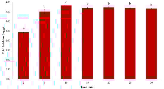 The following step was to optimize the extraction time. For that purpose, multiple extractions were carried out at different extraction times (2, 5, 10, 15, 20, 25, and 30 min), whereas the rest of the variables were fixed at optimal values. All of them were performed in duplicate and the extracts were analyzed by HPLC–UV–Vis to determine the total betalains (mg/g sample) obtained. The average concentrations for each extraction time have been graphically represented in Figure 4.