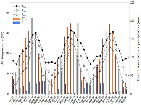 Monthly average maximum, minimum and mean air temperature (Tmax, Tmin and Tmean), accumulated precipitation (P) and reference evapotranspiration (ETo) recorded from Cieza meteorological station, for the period 2018–2020.