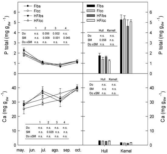 Effects of the fertigation dose (Do) (farmer (F) and half farmer (HF)) and soil management (SM) (bare soil (bs) and cover crops (cc)) and its interaction on the total P and Ca concentration in leaves, hull and kernel tissue in the 2020 season. Data shows the mean ± standard error. Numbers 1 to 4 indicated the leaf harvest sample date; 6 April, 25 June, 11 August and 25 September, respectively. N.s. means that the factor analyzed is not significant, and when significant the p-value is included.