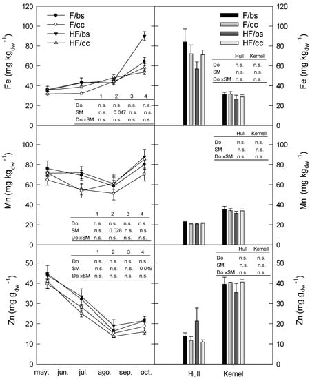 Effects of the fertigation dose (Do)(farmer (F) and half farmer (HF)), soil management (SM) (bare soil (bs) and cover crops (cc)) and its interaction on the Fe, Mn and Zn concentration in leaves, hull and kernel tissue in the 2020 season. Data shows the mean ± standard error. Numbers 1 to 4 indicated the leaf harvest sample date; 6 April, 25 June, 11 August and 25 September, respectively. means that the factor analyzed is not significant, and when significant the p-value is included.