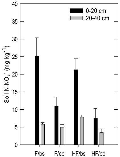 Effects of the fertigation dose (farmer (F) and half farmer (HF)) and soil management (bare soil (bs) and cover crops (cc)) on the soil N-NO3− concentration at two depths. Data shows the mean ± standard error.