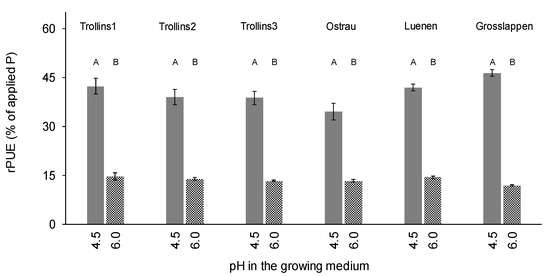 For all tested SSAs, the pH in the growing medium significantly effected the rPUE (Figure 2). While rPUE ranged from 11.9–14.4% at the pH of 6.0, it increased up to 35–46% at a pH of 4.5. However, the extent of this pH effect depends on the SSA type (Figure 3). The rPUE difference between pH 4.5 and 6.0 was significantly lower for the SSAs Trollins2 (25 percentage points), Trollins3 (25 percentage points) and Ostrau (21 percentage points) compared to the SSA Grosslappen (35 percentage points). The SSAs Trollins1 and Luenen showed an intermediate position and did not significantly differ from the SSA Grosslappen.