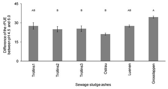 Difference of relative phosphorus use efficiency (rPUE) in percentage points between pH 4.5 and 6.0 for each sewage sludge ash (SSA). Different letters indicate differences between the SSAs (Tukey test, p < 0.05), and error bars indicate standard error of mean (n = 4).