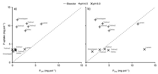 The amount of plant available P estimated by the prediction model of Hauck et al. [23] combining PCAT and PCAL also did not match the P uptake of plants (Figure 6). At a growing medium pH of 4.5, an underestimation of more than 50% was observed for most of the SSAs. At pH 6.0, the underestimation was less serious, but there was also an overestimation for the SSA Luenen.