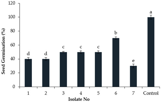 Seeds of cumin variety “Baladi” obtained from the Laboratory of Agronomy, King Abdulaziz University were surface-sterilized with 2% sodium hypochlorite (NaOCl) solution for 15 min, followed by rinsing with sterile distilled water. Seeds primed (20 min) with the suspension of culture filtrates were placed in 90 mm Petri plates (20 seeds/plate) containing three layers of sterile filter paper with sufficient moisture and relative humidity (about 95%). Seeds treated with sterile distilled water were used as healthy controls, while seeds treated with a suspension of pathogen (1 × 105 conidia/mL) only were used as infected controls. Plates were incubated at 25 °C for 7–10 days, and seed germination (%) was calculated as follows [42]: germination percentage = S/T × 100, where S is the number of germinated seeds, and T is the total number of seeds.