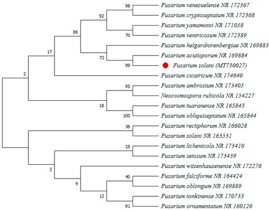 The molecular identification of highly virulent isolate 7 using PCR analysis showed that the length of the obtained sequenced products was 540 bp. Furthermore, BLAST analysis of the obtained sequence showed the highest similarity (100%) with Fusarium solani (GenBank Accession number AF178418). Therefore, isolate 7 was identified as F. solani. The sequences were submitted to NCBI under accession number MT730027. The phylogenetic tree (Figure 2) highlights the relationship between the sequence of the isolate identified in this study (identified as F. solani) and identical sequences obtained from the NCBI, constructed using the bootstrap method.