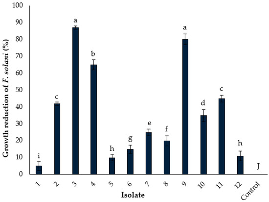 A total of 12 fungal endophytes were obtained from the roots of healthy cucumber plants. In the in vitro screening, all isolates showed antagonistic potential against F. solani. However, significant (p < 0.05) inhibition of the mycelial growth of F. solani was recorded. In the dual-culture assay, isolates 3, 4, and 9 (87%, 65%, and 80%, respectively) demonstrated higher mycelial growth reduction, followed by other endophyte isolates (Figure 3 and Figure 4). Isolates 2, 10, and 11 also demonstrated a significant reduction in the mycelial growth (42%, 35%, and 45% respectively) of F. solani, but the inhibition by these isolates was relatively lower, followed by isolates 3, 4, and 9. Comparatively, all isolates demonstrated biocontrol potential against F. solani; however, isolates 3, 4, and 9 caused a strong and significant reduction (Figure 3). Therefore, these isolates were selected for further evaluation.