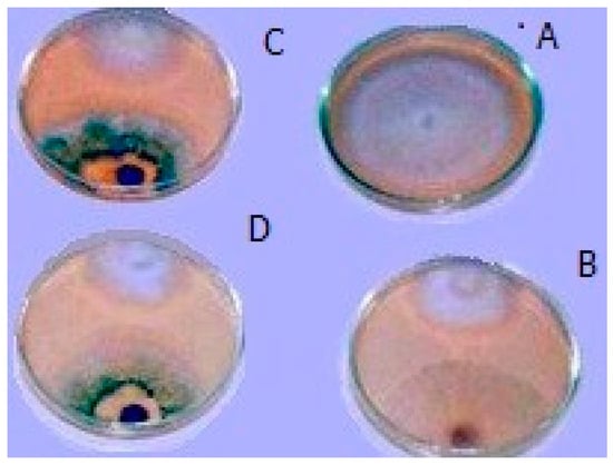 The production of siderophore by selected endophytes was assayed using the Chrome Azurol S (CAS) agar assay [51] with MM9 medium. Briefly, 5 mm mycelial discs from each endophyte (previously grown on iron-deficient MM9 medium supplemented with 1% w/v potato dextrose broth) was placed on CAS agar Petri plates and incubated at 27 °C for 24 h; the clear halo zone around the growing colonies was visualized, and the change in color (dark blue to yellow) was observed. The diameter of the halo zone around the colonies was measured. The experiment was performed twice in quadruplicate.