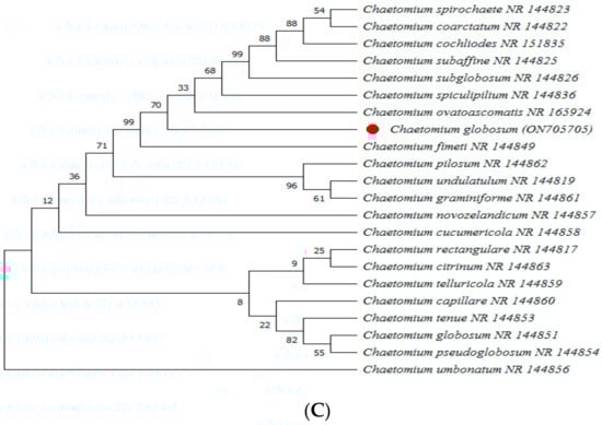 The obtained sequences of PCR products of isolates 3, 4, and 9 were 611, 585, and 562 bp in length, respectively, and the BLAST analysis of these isolates performed in the NCBI database showed the highest similarity (100%) with Trichoderma harzianum (GenBank reference no. KR868283), Trichoderma longibrachiatum (GenBank reference no. MK871186), and Chaetomium globosum (GenBank reference no. MF461354), respectively. The identified sequences were submitted to the public domain of NCBI GenBank under accession numbers MW590687, MT604176.1, and ON705705, respectively. The phylogenetic tree of the identified isolates (Figure 5A–C) constructed using the bootstrap method signifies the relationship of the identified isolates with the sequences available in the public domain of NCBI (Figure 5).