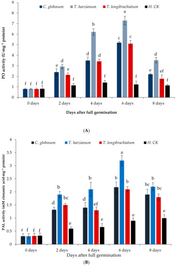 Initially, the PO activity in the culture filtrate-treated cumin leaves was lower, followed by a slight increase after 2 days of inoculation. A significant increase in PO activity after the inoculation of T. harzianum culture filtrates was recorded, followed by an increase in other treatments after 4 and 6 days of inoculation (Figure 6A). In these results, T. harzianum-treated cumin plants demonstrated the maximum PO activity (7.3 U·mg−1 protein) after 6 days of application, whereas the other treatments (T. longibrachiatum and C. globosum) demonstrated lower PO activity. Although no significant difference between T. longibrachiatum and C. globosum after 4 and 6 days was observed, higher PO activity was recorded in both treatments after 6 days. Comparatively, in greenhouse conditions, the application of fungal endophytic bioagents increased the PO activity in cumin plants, potentially by activating the defense system of plants to prevent the infection of pathogen.