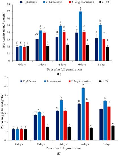 Effect of culture filtrate of fungal endophytic bioagents on the induction of (A) peroxidase (PO), (B) phenylalanine ammonia-lyase (PAL), (C) polyphenol oxidase (PPO), and (D) phenol content in cumin plants under greenhouse conditions. Identical letters within each treatment are not significantly different at the p < 0.05 level of confidence according to the least significant difference (LSD) multiple range test. C. globosum, Chaetomium globosum; T. harzianum, Trichoderma harzianum; T. longibrachiatum, Trichoderma longibrachiatum; H. CK, healthy control.