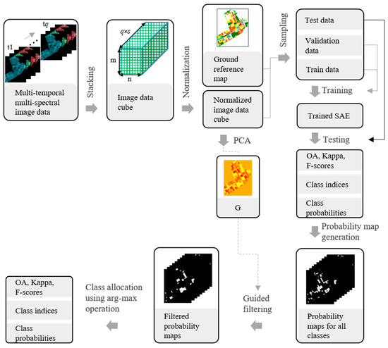 This study proposes a two-step DL-based framework (Guided Filtered SAE; GFSAE) that can adequately exploit spectral, spatial, and temporal information of high-resolution image time series for accurate crop mapping. Firstly, we use a window-based strategy in the feature extraction phase. This process generates spatial-spectral features, which are then fed to an SAE for generating class labels. Secondly, we filter the obtained classification maps utilizing the edge information of the input image data in a post-processing step. Accordingly, they are related to the boundaries of crop fields and, therefore, can be very helpful in the classification. The framework of the proposed method is displayed in