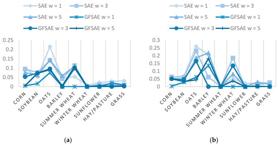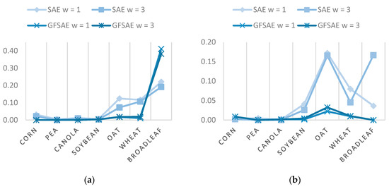 Figure 9 shows commission and omission errors for the Winnipeg dataset. As we see again, the superior performance of the proposed GFSAE framework is proved in reducing both commission and omission errors of different crop types except the broadleaf class. The broadleaf class has a minimal spatial extent, and hence filtering process mixes its information with other classes. Its lower amount of training data compared to other classes (see