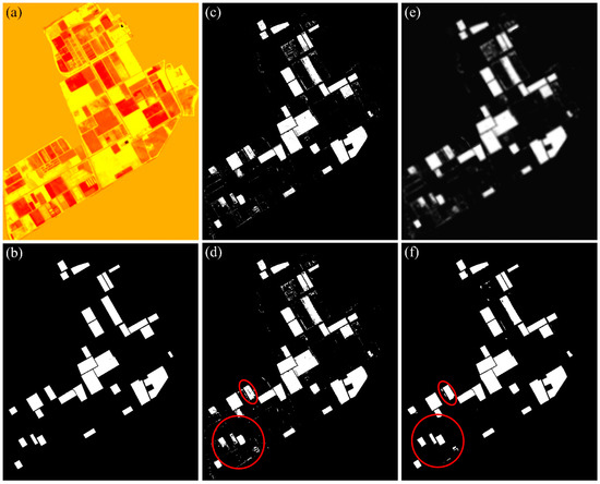 Figure 6a shows the guidance image (G), (b) is the ground reference map for this class, (c) is the initial probability map for the class corn, i.e., P (1), (d) is the initial class map (i.e., the result of SAE), (e) is the probability map, P (1), after the guided filtering, and (f) is the final class map (i.e., the result of GFSAE). As we see, a more accurate map is obtained after the guided filtering process, removing isolated wrongly classified pixels from the class map. To describe precisely, non-corn pixels inside non-corn fields that were wrongly classified as corn class (commission error) and corn pixels inside corn fields that were wrongly classified as other classes (omission error) are corrected after the proposed filtering process. This could also be observed in