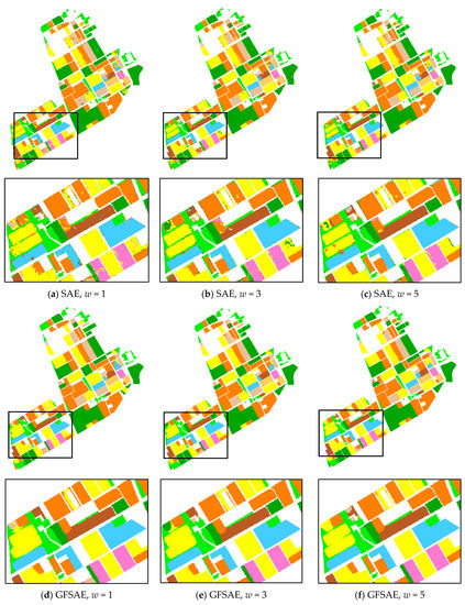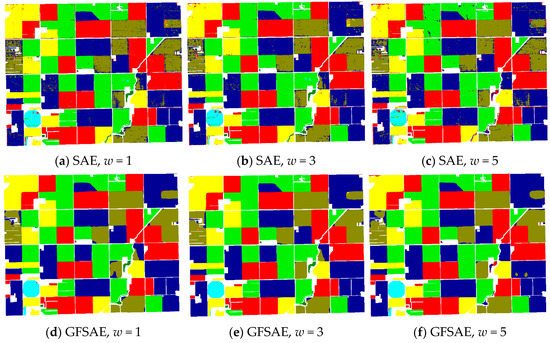 Figure 10 for the Winnipeg dataset. As we can see, in the case of SAE increasing spatial window size did not have a considerable change in the result maps. However, the classification maps obtained from GFSAE significantly improve the original SAE method. They show more accurate field maps with less confusion with other classes compared to SAE results. Specifically, GFSAE with