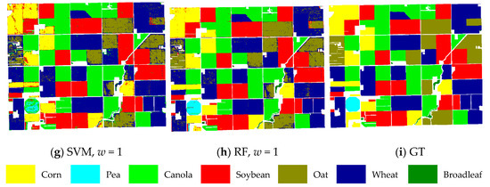 w = 1 and 3 settings perform best. Comparing SAE- and GFSAE-obtained crop maps with ones of the traditional SVM and RF methods also proves the superiority of the proposed method. Specifically, more accurate and homogenous crop maps are obtained with GFSAE. This again proves the superior performance of the proposed GFSAE method in crop mapping compared to the original SAE and traditional methods.