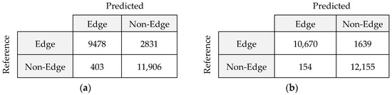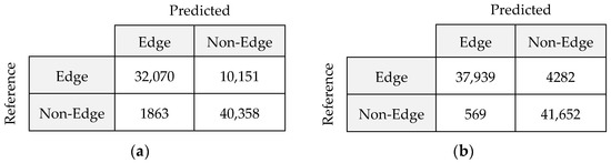 Type I error in the SAE method is 1863, meaning these pixels are incorrectly assigned to the edge class. By implementing a guided filter, 70% of those pixels are removed. Moreover, analyzing type II errors in both confusion matrices shows that the proposed method can restore 58% of edge pixels that are not detected in the SAE algorithm.