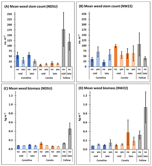 Overall, sulfonylurea-resistant camelina and canola were very efficient at reducing weed stem counts (Figure 3A,B), except for canola at NW22 (Figure 3B), and weed biomass dry weights at both locations without herbicide treatment (Figure 3C,D). Herbicide treatment did enhance weed stem reduction in sulfonylurea-resistant camelina at NDSU (Figure 1A and Figure 3A) and weed biomass dry weight reduction in sulfonylurea-resistant canola mid- and late-season, respectively at NDSU and NW22 (Figure 1C,D and Figure 3D). Indeed, without fallow included in the ANOVA, herbicide was a significant factor for mean weed stem counts and biomass dry weights at NDSU, and for C × H interaction at both locations (Table 1). However, the effect of herbicide treatment on weed stem counts and biomass dry weight, particularly in camelina, at each location (Figure 1A,B) were not consistent. Whereas herbicide treatment reduced mean weed stem counts in camelina at NDSU, herbicide treatment increased mean stem counts in camelina at NW22 both mid- and late-season. Although sulfonylurea-resistant camelina and canola had different effects on weed stem counts at each location (Figure 3A,B), they had a similar trend for reducing weed biomass at each location, except for weed biomass dry weights mid-season in canola plots at NDSU, with or without herbicide treatment (Figure 1C,D and Figure 3C,D).