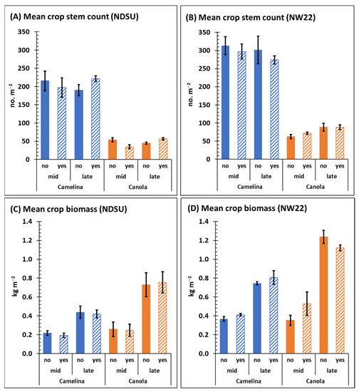 Mean crop stem counts (A,B) and biomass dry weights (C,D) mid- and late-season from field plot of sulfonylurea-resistant camelina and canola at NDSU (A,C) and NW22 (B,D) treated with (yes) or without (no) sulfonylurea. Error bars represent the standard error of the mean.