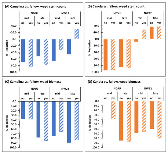 Summary comparison of mid- and late-season reduction (%) based on mean weed stem counts (A,B) and biomass dry weights (C,D) in field plots of sulfonylurea-resistant camelina (A,C) and canola (B,D) treated without (no) or with (yes) herbicide with that of mid- and late-season mean weed stem counts and biomass dry weights of fallow plots at NDSU and NW22. Fallow plots were not treated with herbicide.