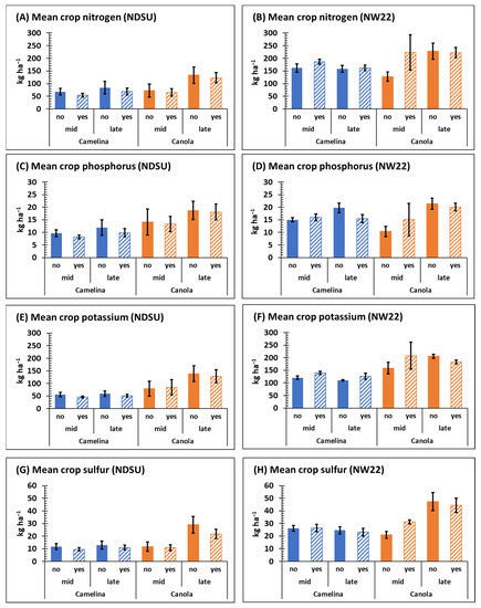 Both sulfonylurea-resistant camelina and canola retained significant levels of nutrient (N, P, K, and S) with or without herbicide treatment. Except for mean phosphorus content at NW22, mid- and late-season N, P, K, and S content was generally greater for canola compared with camelina at both NDSU and NW22 (Figure 5), which may be associated with the greater late-season biomass observed for canola compared with camelina at both locations (Figure 2C,D).