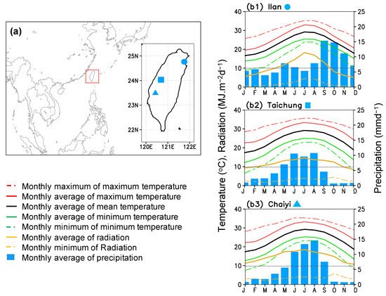 The study was conducted for three main cultivated areas in Taiwan: Taichung, Chaiyi, and Illan (Figure 1a), in which the dry season (January–June) comprises the first rice cultivation. Illan is in the north-east, while Taichung and Chaiyi are in the central-western island (Figure 1a inset). Climatology patterns of these three locations are different (Figure 1b1–b3). During the early to middle period of rice cultivation (January–March), the climate in Illan is wet-cold with low radiation due to cloud cover. In Taichung, the climate is dry-cold with moderate radiation, and in Chaiyi, it is dry-cold with high radiation. Peak rainy season occurs in late spring for Taichung, in summer for Chaiyi, and in fall-winter for Ilan (Figure 1b1–b3) [16]. During the growing period, Chaiyi, Taichung, and Ilan receive radiation of approximately 14.7, 11.5, and 9.6 MJ m−2 day−1, respectively. Rice cultivation in these three locations requires irrigation and rice growth takes place within average temperatures of 16–30 °C. The annual mean temperature of Illan (21.30 °C) is slightly lower than that of Taichung (22.51 °C) and Chaiyi (22.47 °C), making them ideal for rice cultivation. Because of the winter monsoon and cold surge, which can cause the minimum temperature to drop below 10 °C occasionally, the rice crop can be at risk for cold injury in January-February.