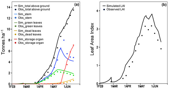 ORYZA(v3) model calibration by using experimental data from 2009; observed (Obs) and simulated (Sim) (a) biomass, and (b) Leaf Area Index (LAI).