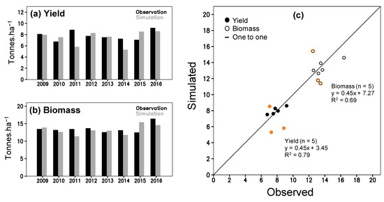 ORYZA(v3) model validation by using experiment data from 2009–2016; observed and simulated (a) yield, and (b) total above ground biomass; panel (c) shows scatter plots for yield and biomass (orange-circle marks are 2011, 2014 and 2015).