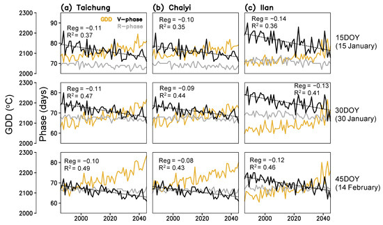 Time series of simulated growing degree days (GDD), lengths of vegetative (V-phase) and reproductive (R-phase) stages for three planting dates (15, 30, 45 day of year) constructed for Taichung, Chaiyi, and Ilan; linear regression coefficients (Reg) and coefficient of determination (R2) between year and V-phase present in each panel.