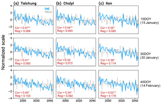 Time series of simulated maturity date (day after emergence; DAE) and yield for three planting dates (15, 30, 45 day of year) constructed for Taichung, Chaiyi, and Ilan; correlation coefficients (Cor) and linear regression coefficients (Reg) between maturity date and yield present in each panel (*, ** indicate significance of the coefficients exceeding 99% and 99.9% confidence interval).