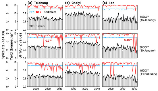 Time series of simulated yield, number of spikelets, spikelet sterility factor because of low temperature (SF1), and spikelet fertility factor because of high temperature (SF2) for three planting dates (15, 30, 45 day of year) constructed for Taichung, Chaiyi, and Ilan; numbers are correlation coefficients of SF2 and yield (*, ** indicate significant of the coefficients exceeding 99% and 99.9% confidence interval).