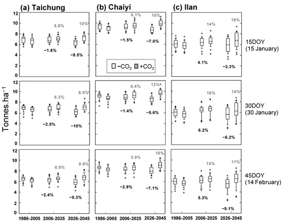 Figure 5 shows that rice phenological stages respond to the rising temperature with a simulated shortening. By 2045, rice maturation at Taichung, Chaiyi, and Illan will be faster by 7–9, 6–8, and 7–11 days compared to the 1980s. The change rates of the vegetative phase and maturity dates are greater in Ilan (1.2–1.4 and 1.2–1.8 day decade−1) than in Taichung (1.0–1.1 and 1.1–1.5 day decade−1) and Chaiyi (0.8–1.0 and 1.1–1.4 day decade−1). The earlier planting date results in the shorter duration of crop growth. On the other hand, the vegetative phase is more responsive to increased GDD than the reproductive stage (panicle initiation to maturation), regardless of with or without CO2 effects. This simulation suggests that the significant change in winter temperature (January-February) can lead to a decreasing trend of maturity date and, in turn, cause the yield reduction in all three locations throughout 1986–2045 (Figure 6).