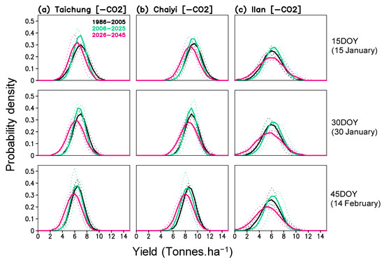 Probability density function of simulated yield (without projected CO2) for three planting dates (15, 30, 45 day of year) and three periods (1986–2005, 2006–2025, 2026–2045) constructed for Taichung, Chaiyi, and Ilan; solid lines are averaged values from 3 models and dotted lines are values of each model.
