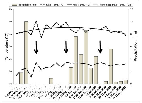 Climatic conditions at the experimental site, in Kampepen, Yucatan, Mexico. Solid line (polynomial trend line) represents the evolution of mean maximum temperatures. Arrows indicate dates of harvesting for each of three harvest dates.