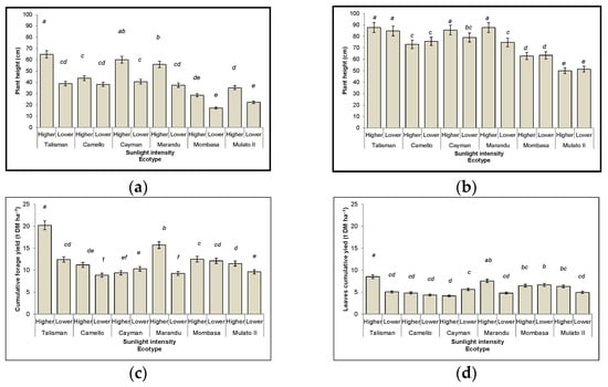Mean plant heights that the ecotypes reached during the different measurement dates were 40, 73, 96 and 65 cm at 77, 106 and 138 DAS, and 48 days after first harvest, respectively. Significant (p < 0.050) ecotype x sunlight intensity interactions were recorded for the first and second measurement dates (Figure 2a,b). In the third measurement date, only the ecotypes factor was highly significant (p < 0.0001); which measured, from the tallest to the shortest, Mombasa, Marandu, Cayman, Talisman, Camello and Mulato II, with 120, 109, 91, 89, 84 and 82 cm, respectively. At the fourth measuring date (48 days after the first harvest), both ecotype and sunlight intensity were highly significant (p < 0.0001, in both cases), reaching heights of 92, 70, 66, 58, 56 and 50 cm for Mombasa, Marandu, Camello, Cayman, Talisman and Mulato II, respectively, while for sunlight intensities, the tallest ecotypes (73 cm) were found under a low sunlight intensity (heavier shading), and the shortest (58 cm) were found under the highest sunlight intensity (lightest shading).
