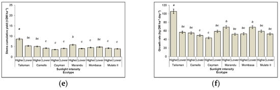 Stem yield, similar to the leaves component, resulted in a significant (p = 0.021) ecotype x sunlight intensity interaction (Figure 2e). Ecotypes Talisman and Marandu yielded greater stem biomass under the highest rather than the lowest sunlight intensity; whereas the rest of the ecotypes, Camello, Cayman, Mombasa and Mulato II, yielded similarly (p > 0.050), regardless of the sunlight intensity regime to which they were subjected.