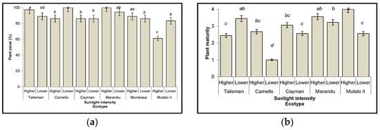 Effect of the interaction between Brachiaria spp. ecotypes and M. maximus with sunlight intensity on (a) percent plant canopy cover; and (b) plant maturity just prior to second harvest (excepting M. maximus)—numbers 1 to 4 on the y-axis in (b) represent degree of maturity: 1 = visible inflorescence, 2 = 4 to 5 visible joints, 3 = 2 to 3 visible joints and 4 = 0 to 1 visible joints (tillering or leafy stage). Lines above each mean value (gray bars) represent 5% errors. Different letters across means are different (p < 0.050).